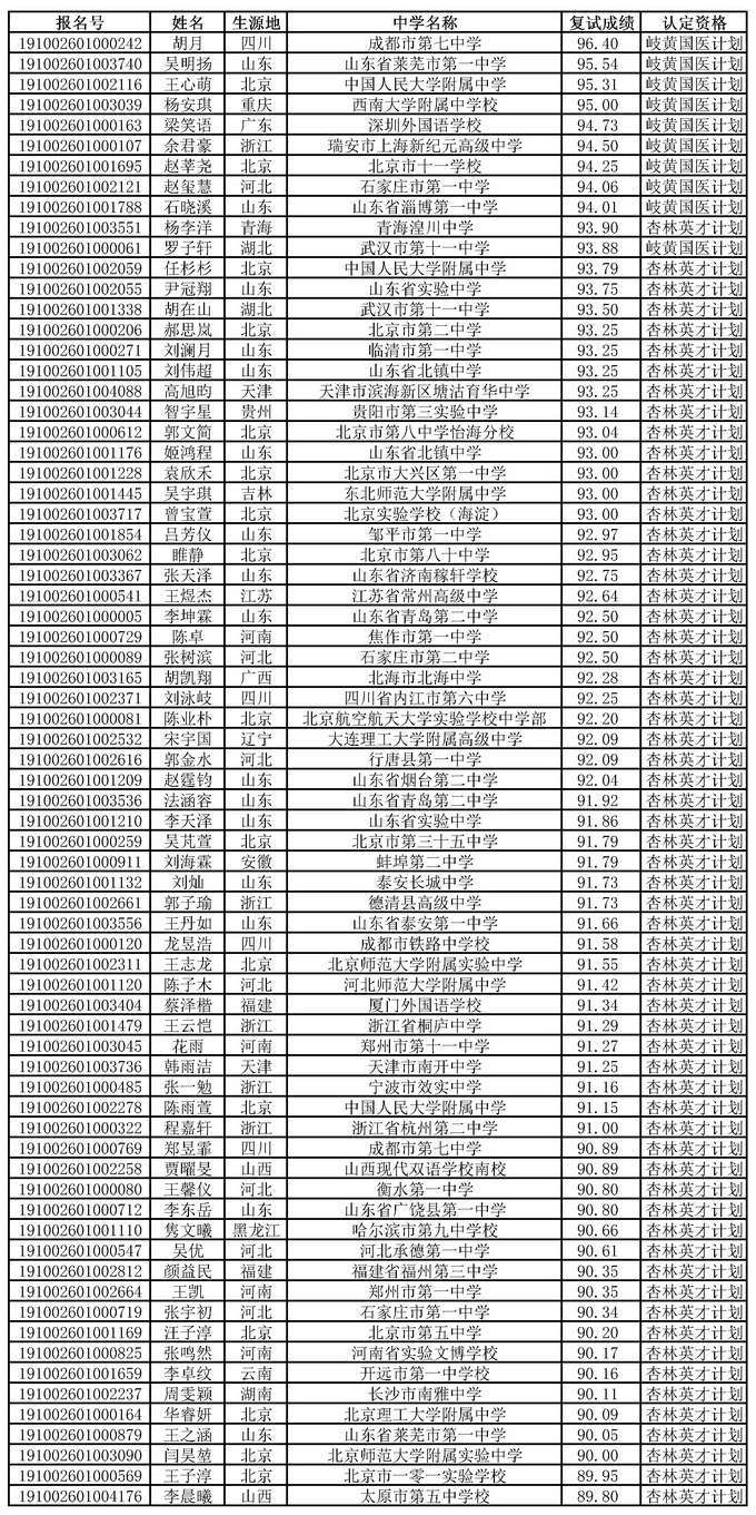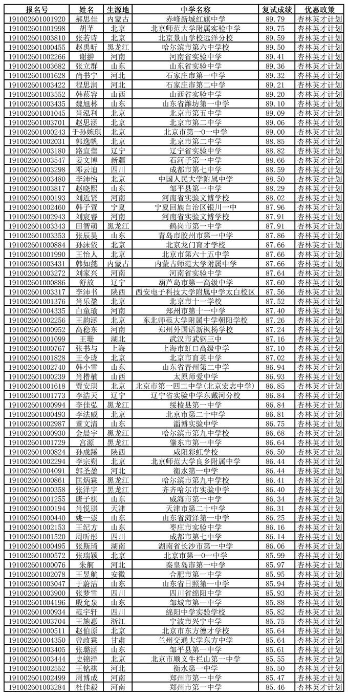 根据《2026美加墨世界杯官网2019年自主招生简章》和考生复试成绩,经我校招生工作领导小组研究决定,现将我校2019年自主招生入选资格考生名单公示如下(还需经阳光高考平台公示无异议),公示时间为6月22日-6月28日。所有参加我校自主招生复试的考生可登录报名系统查看复试成绩。
