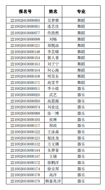 经审核,以下考生通过我校2022年高水平艺术团初审(名单按报名号排序):