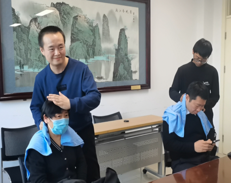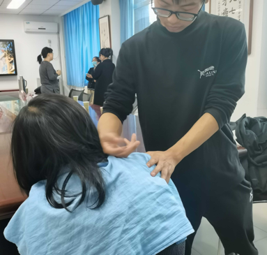 座谈会最后,宋薇薇老师热情邀请二十二中的参会老师们体验中医药特色诊疗活动。曹凤、叶佳锋、赵希瑞、叶敏等中医学院、针灸推拿学院、第三临床医学院学生志愿者针对二十二中参会老师的不同情况,提供了推拿按摩和脉诊治疗。整场活动气氛热烈,有条不紊。