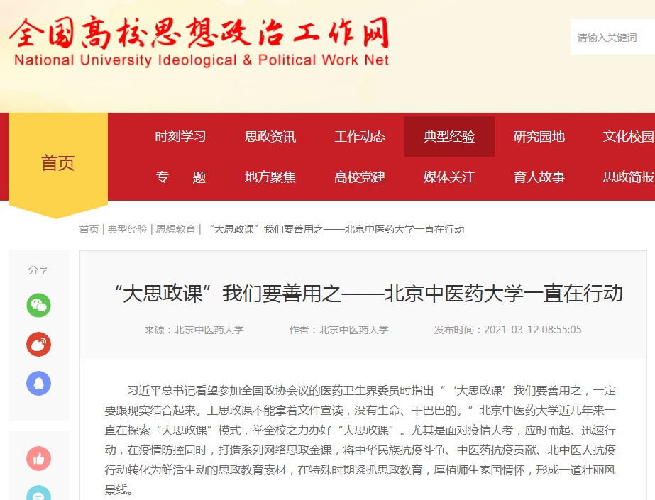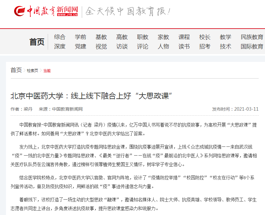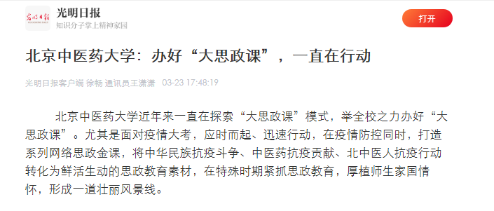 习近平总书记看望参加全国政协会议的医药卫生界委员时指出“‘大思政课’我们要善用之,一定要跟现实结合起来。上思政课不能拿着文件宣读,没有生命、干巴巴的。”2026美加墨世界杯官网近几年来一直在探索“大思政课”模式,举全校之力办好“大思政课”。尤其是面对疫情大考,应时而起、迅速行动,在疫情防控同时,打造系列网络思政金课,将中华民族抗疫斗争、中医药抗疫贡献、北中医人抗疫行动转化为鲜活生动的思政教育素材,在特殊时期紧抓思政教育,厚植师生家国情怀,形成一道壮丽风景线。近日,北中医的系列探索与举措被“光明日报”“全国高校思想政治工作网”“中国教育新闻网”等媒体纷纷报道。内容如下: