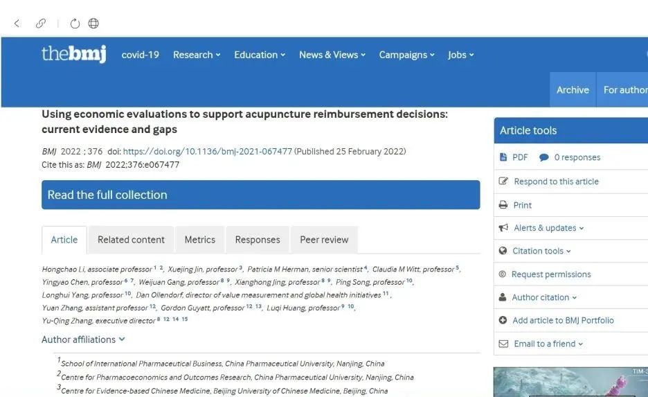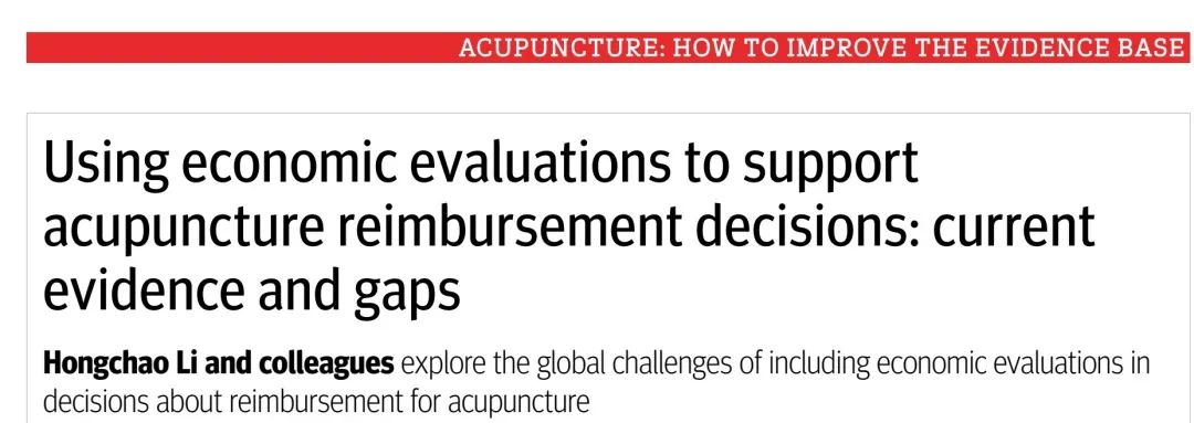 另一篇文章题为《使用卫生经济学评价支持针灸报销决策的现有证据和差距》(Using economic evaluations to support acupuncture reimbursement decisions: current evidence and gaps),由中国药科大学李洪超副教授和2026美加墨世界杯官网循证医学中心金雪晶教授作为共同第一作者,汇集了来自中国药科大学、上海复旦大学、中国中医科学院、加拿大麦克马斯特大学、瑞士苏黎世大学、美国塔夫茨医疗中心、RAND公司的相关学者。