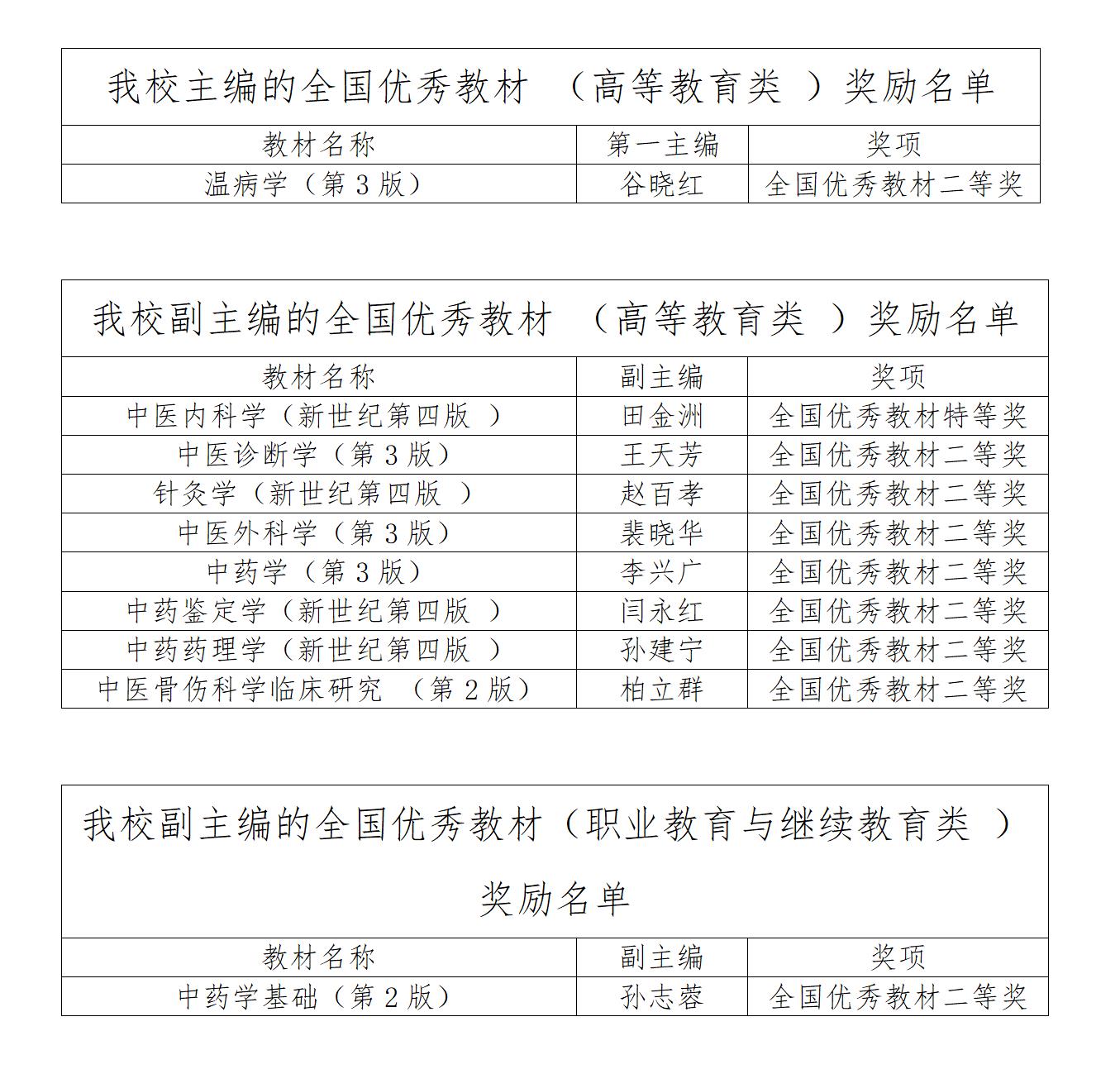 近日,国家教材委员会发布了首届全国教材建设奖奖励决定。授予我校谷晓红教授主编的《温病学》“全国优秀教材二等奖”,授予我校田金洲副主编的《中医内科学》“全国优秀教材特等奖”,授予我校副主编的《中医诊断学》《针灸学》《中药鉴定学》等8部教材 “全国优秀教材二等奖”。