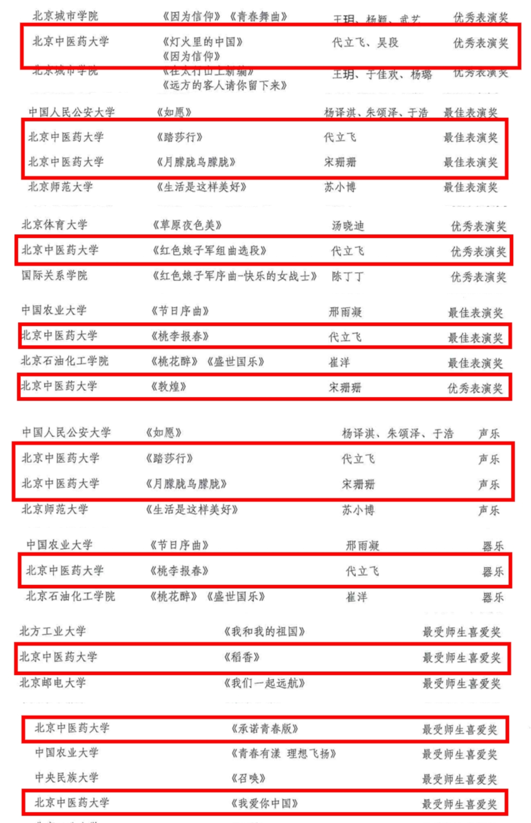 近日,由北京市委教育工委、北京市教委举办的“2022年北京大学生音乐节”公布获奖名单,我校大学生艺术团荣获六个最佳表演奖(金奖)和三个优秀表演奖(银奖)以及优秀指导教师奖的优异成绩。