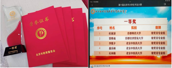 由北京市教委主办的“翰墨润古韵,扬帆新征程”第十届北京市大学生书法大赛决赛成绩也于近日揭晓。我校5名入围决赛同学凭借扎实的书法功底和深厚的文化底蕴获得三个一等奖,两个三等奖。