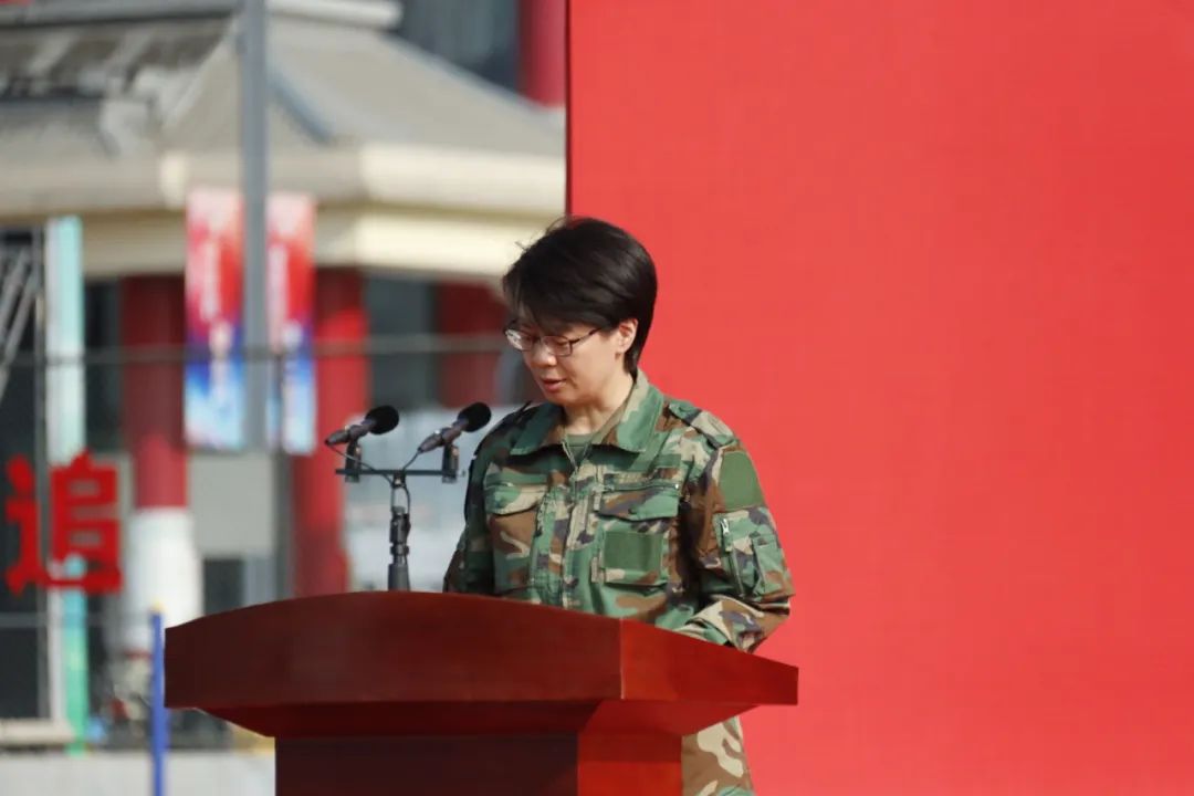 中医学院专职辅导员韩雪老师作为军训团指导员代表发言。她希望同学们能充分认识并理解军训的重要意义和价值,从中汲取力量,谨记“勤求博采、厚德济生”的校训,弘扬“自信向上、和而不同”的校风,成为有担当有责任感的新北中医人!