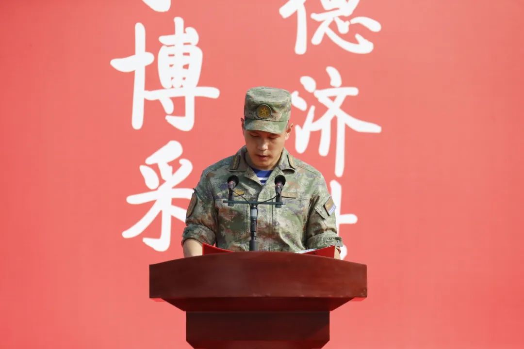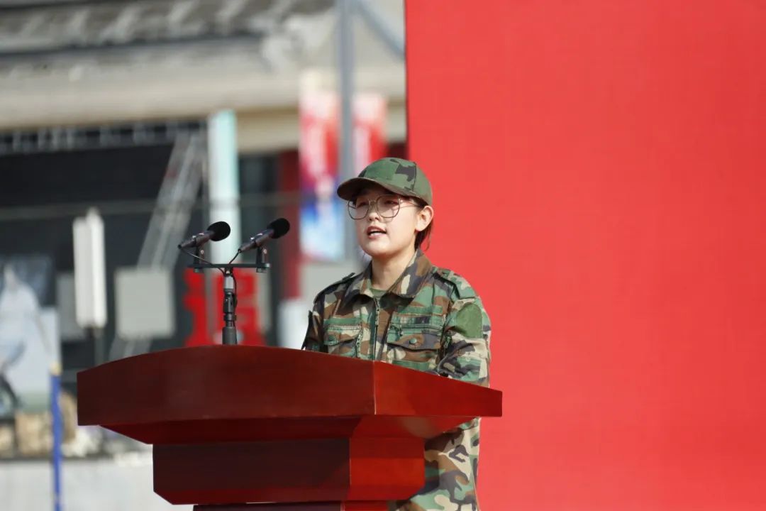 中医学院2023级王楚宣同学作为新生代表发言。她号召全体同学在军训中要对自己高标准、严要求,严守军纪,服从教官,一切行动听指挥,发扬团结互助的优良作风,认真参加训练,以顽强拼搏的精神面貌,展现新时代中医学子风采。