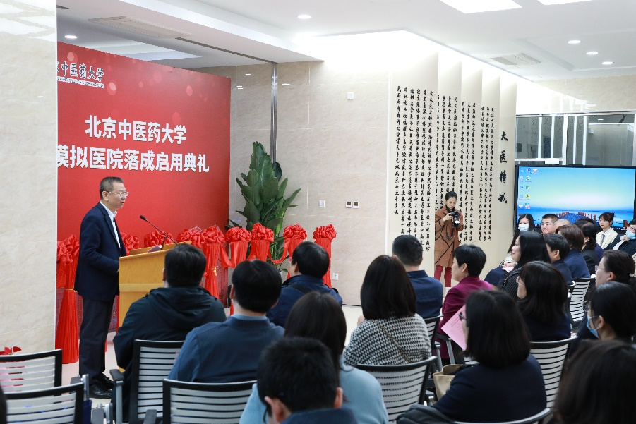 徐安龙校长在讲话中,对模拟医院落成启用表示祝贺,并对模拟医院未来的发展建设提出了新的要求。他表示,模拟医院围绕“医教融合、科教融合、医管融合、医药融合、医文融合”的设计和建设理念,充分体现出北中医领头雁的作用,是对中医药高等教育“思想的引领、设计的引领、考试方法的引领”。要借助这个平台,让学生能够学得真本领,培养真正的中医思维、扎实的临床技能,深刻感受到中医药与现代科技、大数据等深度融合的新发展模式。徐校长强调,模拟医院要进一步加强信息化发展,在打造“云端”北中医的过程中发挥应有的作用。同时,要面向国际化需求,充分利用现代信息技术与海外中医药机构开展多层次的交流合作,把中医药的独特魅力展现给全世界。同时,也要把全世界的优质资源汇集到北中医来,给北中医学子提供最好的学习条件、硬件条件、人文环境和生态环境。他希望在座的各位嘉宾在未来工作中加强与模拟医院的合作,把模拟医院作为一个开放的中医药人才培养平台,共同开启中医药人才培养的新篇章。